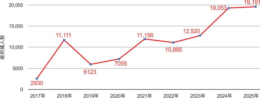 图1:2017年—2025年全能神教会基督徒被抓捕人数